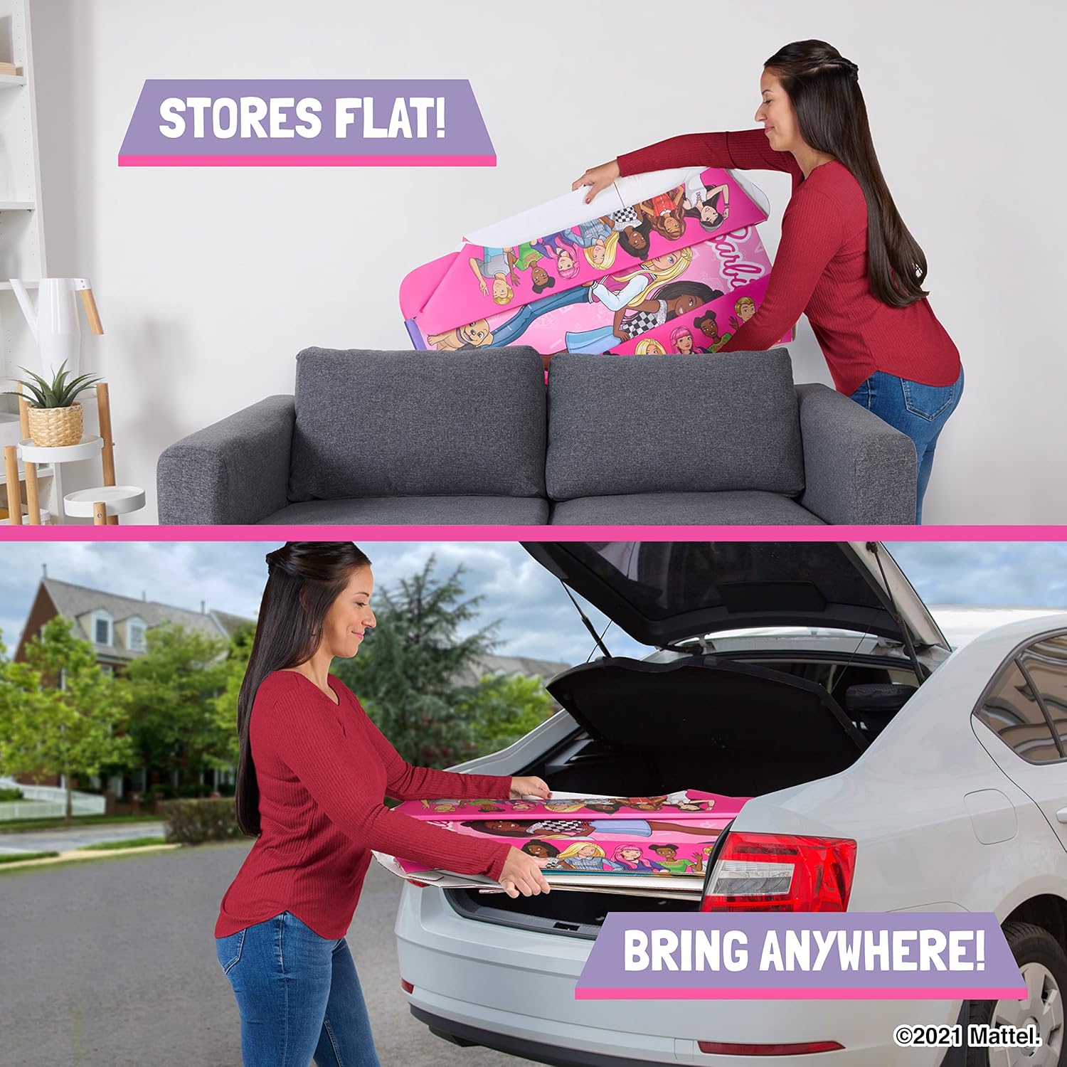 Pop2Play stores flat and out of the way, so you can get your living room back! Plus, you can bring your Pop2Play Barbie Slide wherever you go!