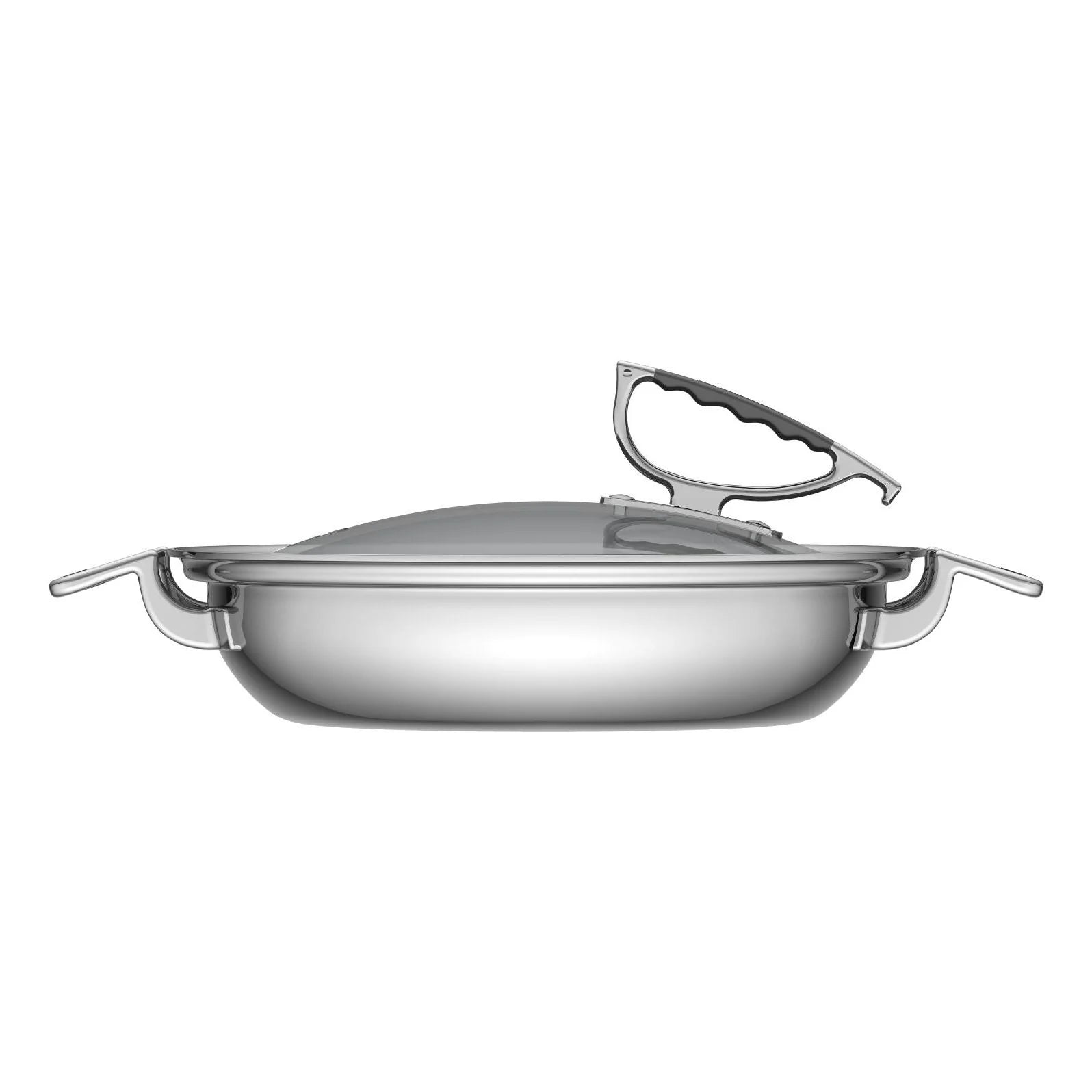 The CookCraft 12” Dual Handle Casserole with glass latch lid combines beauty and sophistication with the durability of tri-ply stainless steel. The 12” casserole has a 3 quart capacity and is designed to go from stove-top to table.
