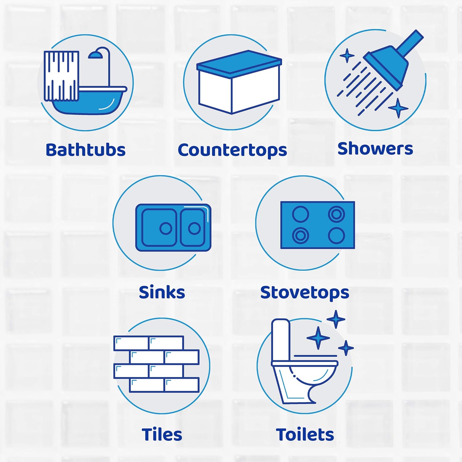 Deep-cleaning gel formula enhanced with bleach to tackle tough stains, soap scum, and mildew on surfaces like tubs, tiles, counters, and more